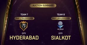 The auction process for two new Pakistan Super League (PSL) teams has concluded in Islamabad, with the franchises sold for 1.75 billion PKR and 1.85 billion PKR respectively. The seventh PSL team, Hyderabad, was acquired by Fawad Sarwar of the FKS Group with a winning bid of 1.75 billion PKR.